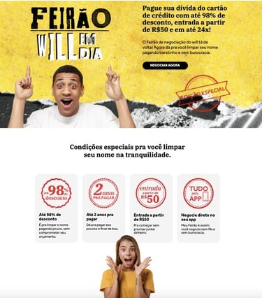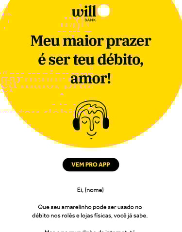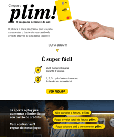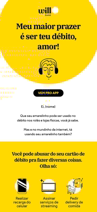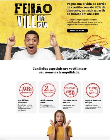 Minha contribuição para a marca, foi desenvolver textos para os canais digitais seguindo a linguagem e o tom de voz. Aqui, você pode conferir alguns e-mail marketing e landing pages que criei para o Will Bank.