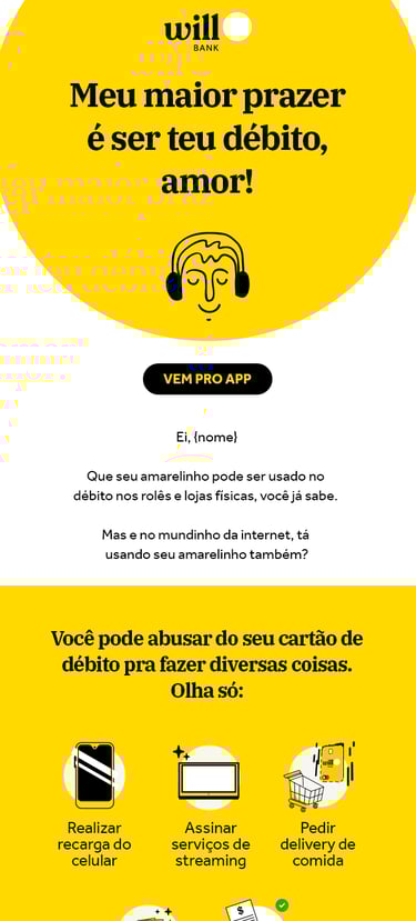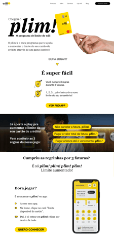 Minha contribuição para a marca, foi desenvolver textos para os canais digitais seguindo a linguagem e o tom de voz. Aqui, você pode conferir alguns e-mail marketing e landing pages que criei para o Will Bank.